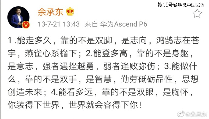 集微网消息(文/holly),今(5)日午间,华为消费者业务CEO余承东发微博回顾其2013年发的微博,并称华为终端能够走到今天,这四条至关重要,即志向、意志、智慧和胸怀。