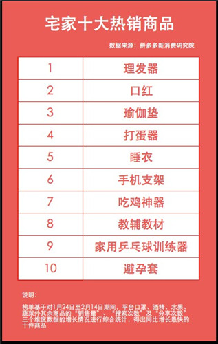 2月19日,电商平台拼多多发布“宅家十大热销商品”榜单
