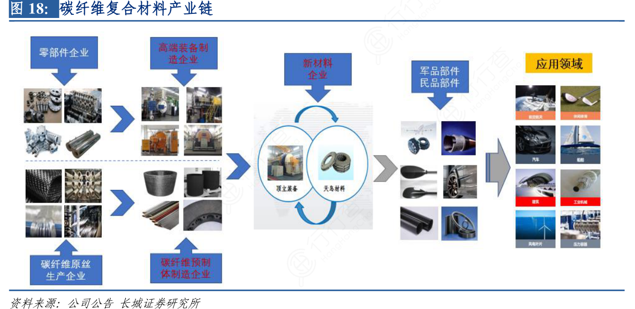 碳纤维复合材料产业链包括上游的碳纤维生产,中游的纤维织物和碳纤维预浸料,中下游的碳纤维复合材料结构件以及最下游的应用的终端产品。碳纤维与树脂的结合,可以是在中游的环节制作成预浸料,也可以是在中下游的结构件制造环节,结构件生产的过程中结合,主要取决于选择的制造工艺。