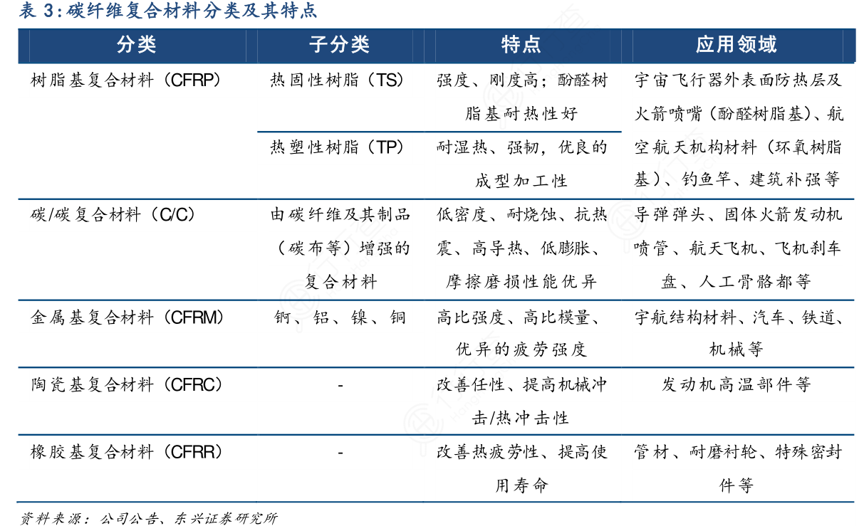 碳纤维复合材料以CFRP为主。碳纤维是由有机纤维经碳化及石墨化处理而得到的微晶石墨材料,与其它材料具有很高的相容性,兼备纺织纤维的柔软可加工性,并且容易复合,具有很大的设计自由度。目前碳纤维复合材料以树脂基复合材料(CFRP)为主,占全部碳纤维复合材料市场份额的90%以上。CFRP具有质量轻等一系列突出的性能,在对重量、刚度、疲劳特性等有严格要求的领域以及要求高温、化学稳定性高的场合,碳纤维复合材料都具有很大优势。