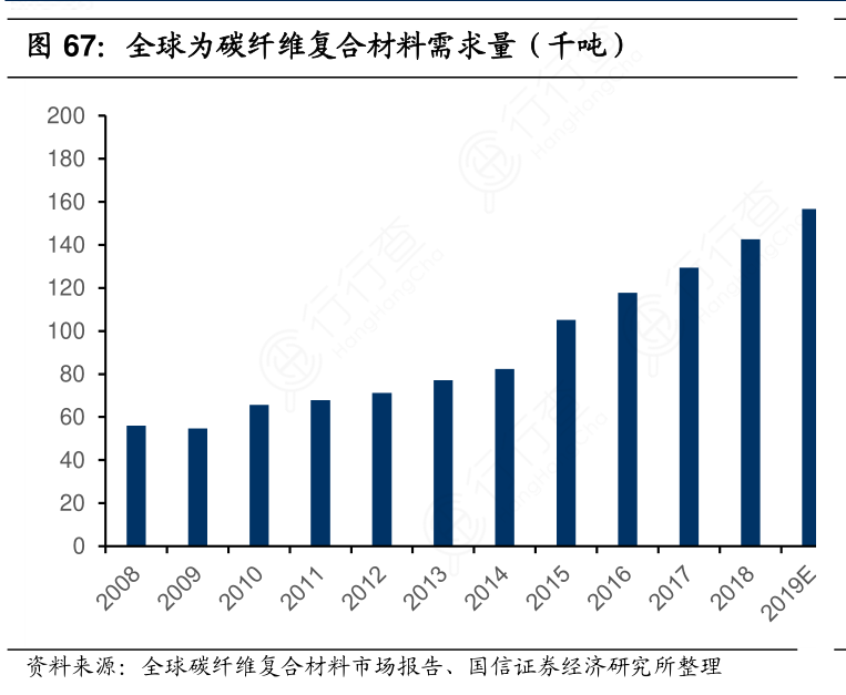 我国碳纤维复合材料在航空航天领域较为欠缺,民用国产大飞机的研发和普及会带来大的增长点。当前由于成本问题碳纤维材料在汽车上用量较少,在碳纤维技术创新和成本降低的催化下,汽车用碳纤维复合材料有望增长。体育休闲领域碳纤维材料是我国的强项,国家十三五政策也明确表示鼓励具有知识产权的运动品牌,随着国产消费升级,用量也会持续增长。