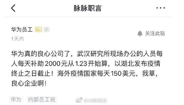 近日,有华为员工在脉脉发帖,称武汉研究所现场办公人员每人每天补助2000元。这项补贴从1.23开始算,直至湖北官方发布疫情终止之日截止。