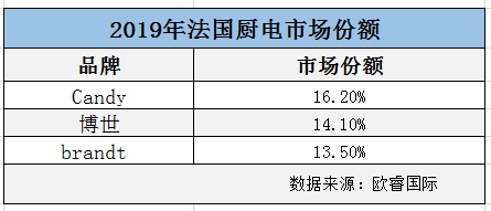 法国市场2019年厨电数据出炉,据欧睿国际统计数据显示,法国厨电市场前3名的分别是,海尔智家旗下Candy厨电市场份额 16.2%,博世厨电市场份额14.1%,法国当地厨电品牌brandt的市场份额13.5%。