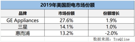 此前,美国权威机构TraQline 2019年数据显示,美国厨电市场份额前3分别是GE Appliances 、三星、惠而浦,这3大品牌也占据着美国家电主流地位。作为“海尔系”厨电重要组成部分的GE Appliances厨电份额27.6%,三星份额14.1%,惠而浦13.2%。