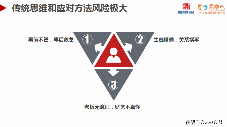 我们来看看传统都是什么样的一个思维模式,我把它进行了一些总结,传统思维模式就叫事前不管,事后救急;生逃硬偷,关系摆平;老板无意识,财务不真懂;老板以为财务懂?财务又不真懂,然后事前一般不管,都是事后去救急,这就是传统思维就是过去的一种思维模式。