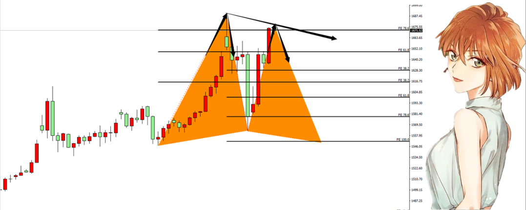 既然都没有,那现在既然我有做空,肯定要坚守到最后的信号失守为止,怎么可能在这时候忽然放弃?不管你们定义垂死挣扎也好,破罐破摔也好,我只认同目前我对行情的判断,这波拉升在1675受压形成次高之后,很大程度会开启新一轮的回调下跌,而幅度,在今晚非农期间会先挑战一下1651回撤点,也就是上轮大涨和大跌后的61.8%拓展位置,这里也能验证当前右侧Crab形态能否完成CD点的下行波段,AC点的头部确定,就是在本次1651的下行到位。