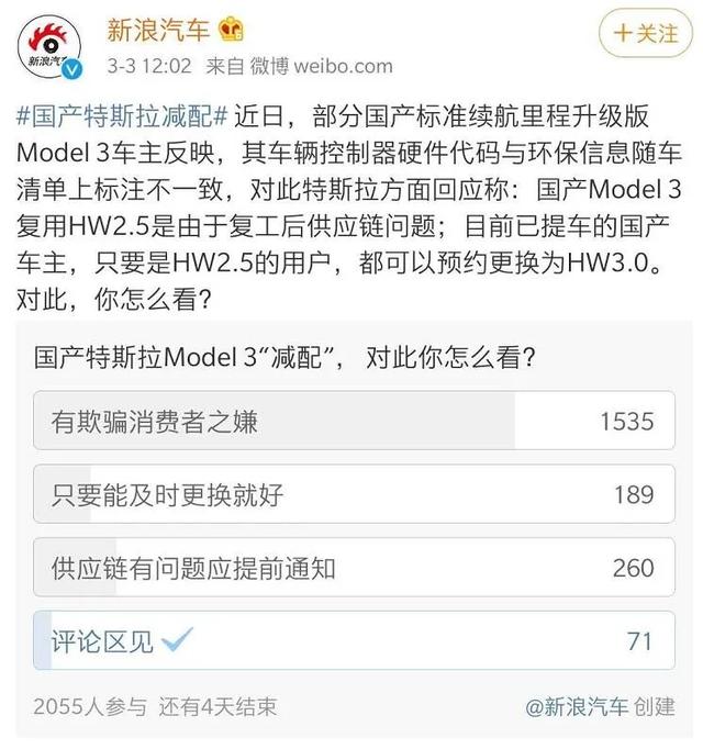 对于官方这样的答复,网友们无法感到满意,在新浪汽车发起的投票中,仅有9%认为能更换芯片就好,认为特斯拉的行为有欺骗消费者之嫌的比例高达75%。还有不少网友留言称,特斯拉"偷梁换柱"的行为涉嫌消费欺诈,应该退一赔三。