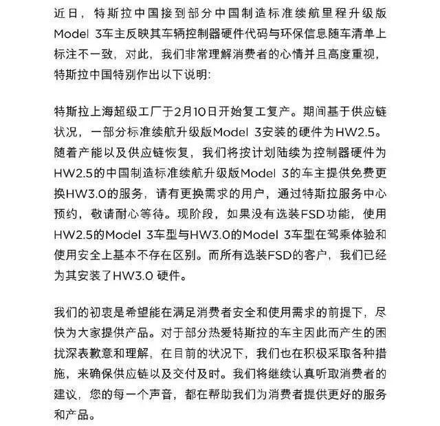 随着越来越多的人加入声讨的队伍,特斯拉在3月4日做出回应,但公告全文不仅没有任何针对此次隐瞒消费者的行为的道歉,还将原因归结于供应链方面,而且仅承诺为选装了FSD(完全自动驾驶功能)的客户免费升级HW3.0硬件,未选装FSD的用户在选装后才可以享受免费升级。