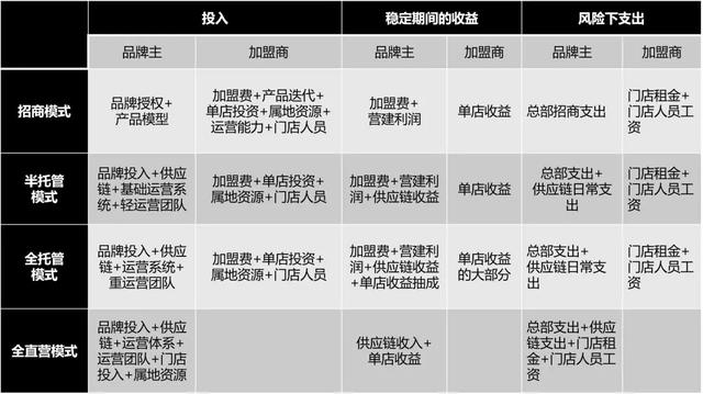 从上图很容易发现,在不确定因素下,半托管和全托管模式的品牌抗风险能力明显比直营模式和招商模式强很多,因为绝大部分的风险是由加盟商来分担了,而品牌总部除了此前一次性收取的加盟费,还有供应链、管理费等持续收益,风险可控、有持续的多线条收入。