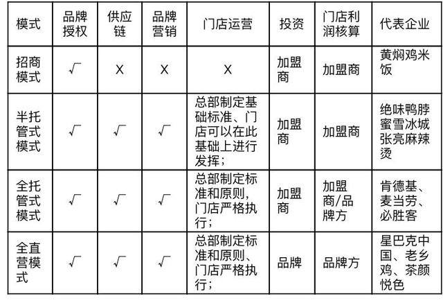 中国餐饮连锁模式,不同的圈子从不同维度进行了划分,比如实战界的招商圈把连锁模式分为紧密型、半紧密型、松散型;学术型的特许经营专家圈,将连锁模式分为直营连锁、特许经营、自由连锁。