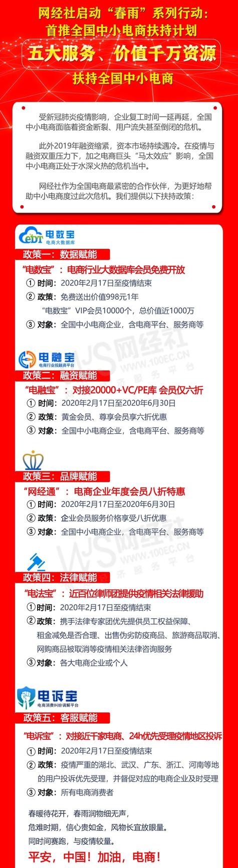 在疫情与资本市场的双重压力下,全国中小电商期待一场滋养产业的“春雨”。为更好地帮助中小电商度过危机,网经社宣布自2月17日起启动“春雨”系列行动,通过政策优惠、资源对接、法律援助等方式帮助中小电商。