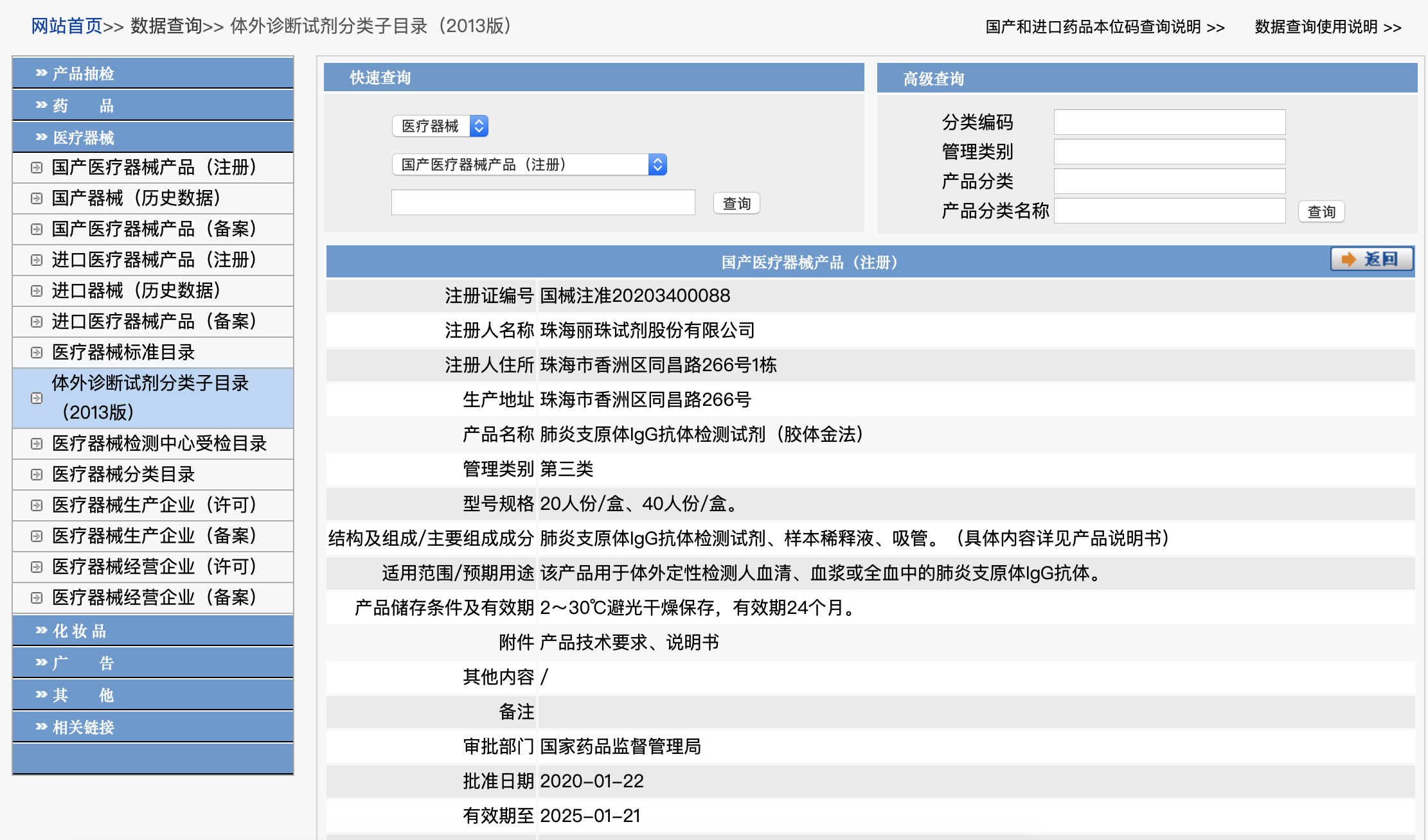 国家药监局网站显示有丽珠试剂自主研发的“肺炎支原体IgG抗体检测试剂盒(胶体金法)医疗器械注册信息。