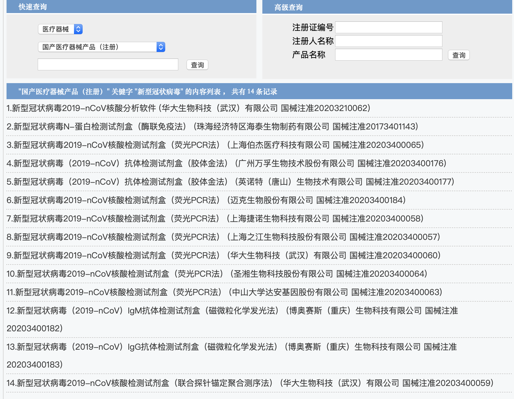 据了解,新冠病毒检测试剂盒属于第三类医疗器械,必须经国家药品监督管理局批准取得医疗器械注册证。南都记者通过国家药品监督管理局“国产医疗器械产品”数据查询栏目下,键入“新型冠状病毒”关键词,立刻显示出14条记录。其中,13条记录为新型冠状病毒检测试剂盒,研发团队包括万孚生物、中大达安基因、上海之江生物、华大生物科技等。另外1条为华大基因研发的新冠病毒核算分析软件。广州市市场监管局称,目前国家批准注册的新冠病毒检测试剂盒并未有家用自测版,不属于消费者个人使用的产品,不能经由网络销售给消费者个人。