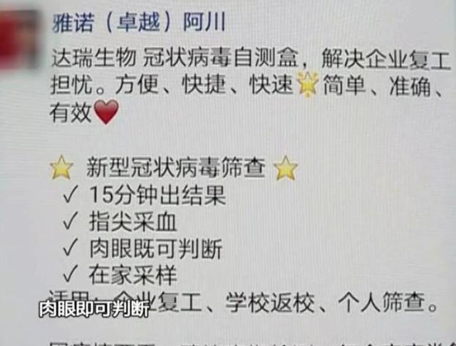 前不久,一款号称在家就可自测是否感染新冠病毒的检测试剂盒在微信朋友圈中出现。卖家宣称,在家指尖采血后,只需15分钟就能检测是否感染新冠病毒,肉眼即可判断。适用范围上还特别标明,适用于企业复工、学校返校、个人筛查等用途。卖家表示,这款自测盒单价150元,多买还能享受优惠,疫情期间建议定期检测,作为家庭常备用品。