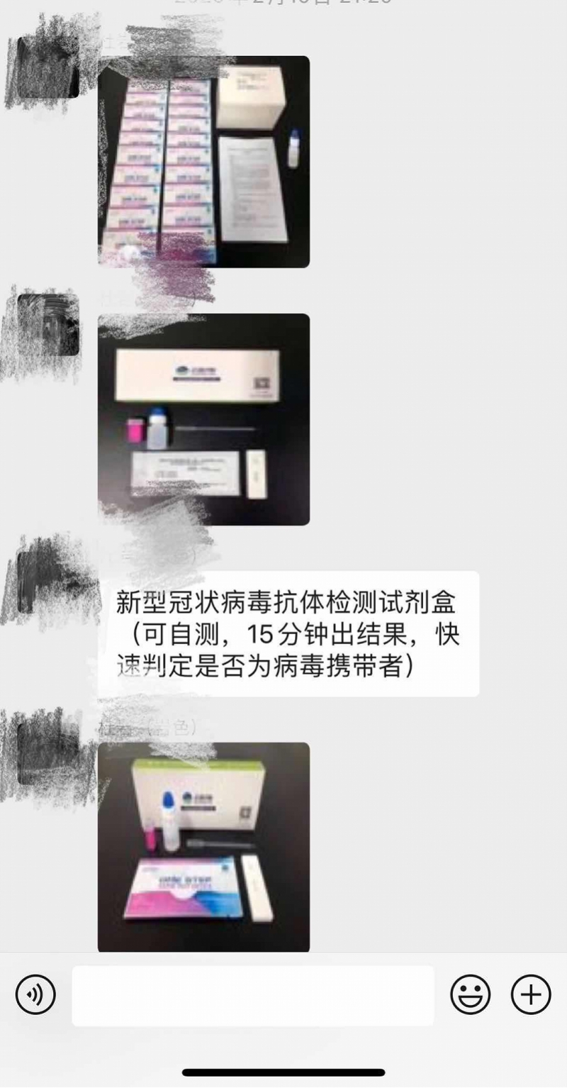 “新型冠状病毒检测试剂,15分钟出结果,全国统一售价168元,复工在即,一款可以自己在家检测的试剂,简单、方便、安全、准确。”根据媒体报道,部分“微商”的货源来自深圳一家名为“生命之源”的医疗服务机构。据媒体报道,微商发布的试剂盒图片、使用视频,检测套餐、检测服务机构的资质证明,还有一篇丽珠试剂官方公众号文章《重磅!丽珠试剂联合中科院武汉病毒所又成功研制出快速胶体金抗体检测试剂,15分钟内出结果》。