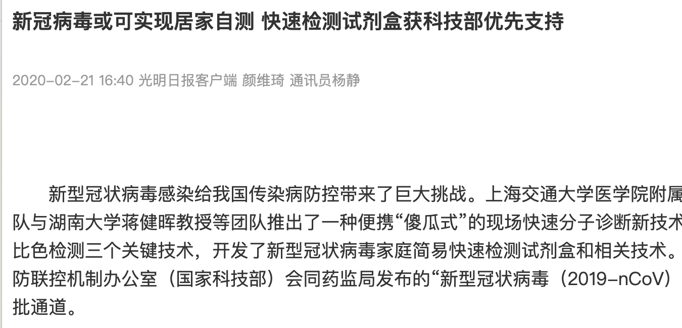 根据媒体报道,上海交通大学医学院附属仁济医院分子医学研究院谭蔚泓院士和杨朝勇教授等组成的团队与湖南大学蒋健晖教授等团队推出了一种便携“傻瓜式”的现场快速分子诊断新技术,开发了新型冠状病毒家庭简易快速检测试剂盒和相关技术。该项目正与多家定点医院合作进行临床试验,已完成100多例临床样本的测试,阳性样本的检出率约为90%,其它检测指标到达金标准水平,目前正在完成检测试剂盒的优化和定型。