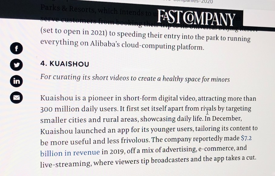 快手入选美国FastCompany“中国十大最佳创新公司”