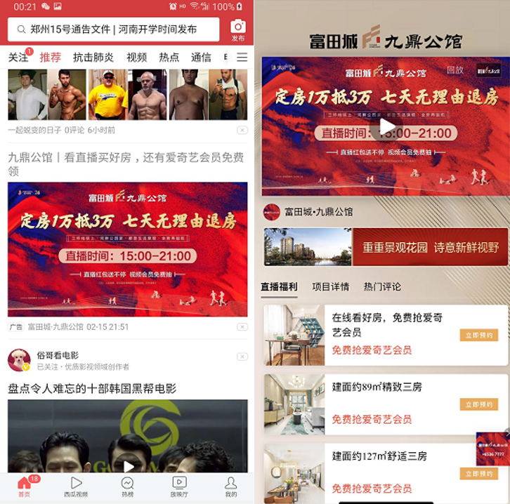 在同一天,富田城·九鼎公馆在今日头条平台推出的商业化直播正式开播,活动定向覆盖河南郑州区域的用户。活动全天共计曝光总数超过126万次,直播间进入总数超过1.5万次,共计登记意向客户216组,参与抽奖177组。此外,活动还特地搭建了独一无二的直播间界面,可供用户观看直播预告、直播互动、直播回顾等,还能查看项目详情介绍、直接点击头像进入富田城·九鼎公馆抖音企业号,全方位了解直播内容和品牌信息。