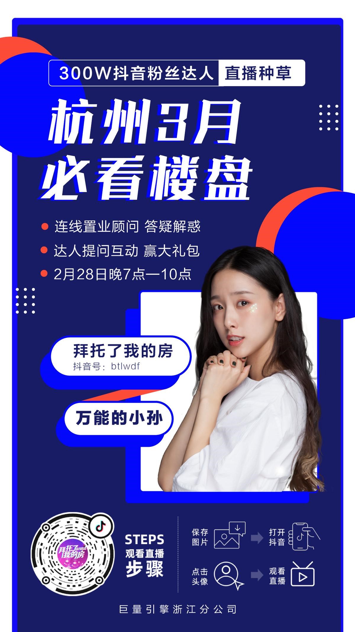 2月28日,新界2020等浙江本地的多家房地产品牌纷纷参与“拜托了我的房”系列直播。活动以“杭州3月必看楼盘”为主题,首次以原声直播连麦形式,捆绑多家房企同场专题直播,并邀请拥有300万粉丝的抖音红人万能的小孙坐镇。在直播中,活动创新推出了房产达人直播间连线置业顾问、在线看样板房直播种草、评论区答疑解惑、答题互动赢大奖等多样玩法,并通过“房企市场渠道+线上推流”的形式,促进了传播效果的最大释放,加深了用户对楼盘信息的直观印象。