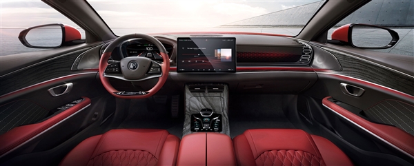 官图中,汉中控台整体采用均衡、对称式设计;中国红色系的座椅加上中控台、方向盘以及门板上的红色装饰,也给人带来了一定的视觉冲击感。