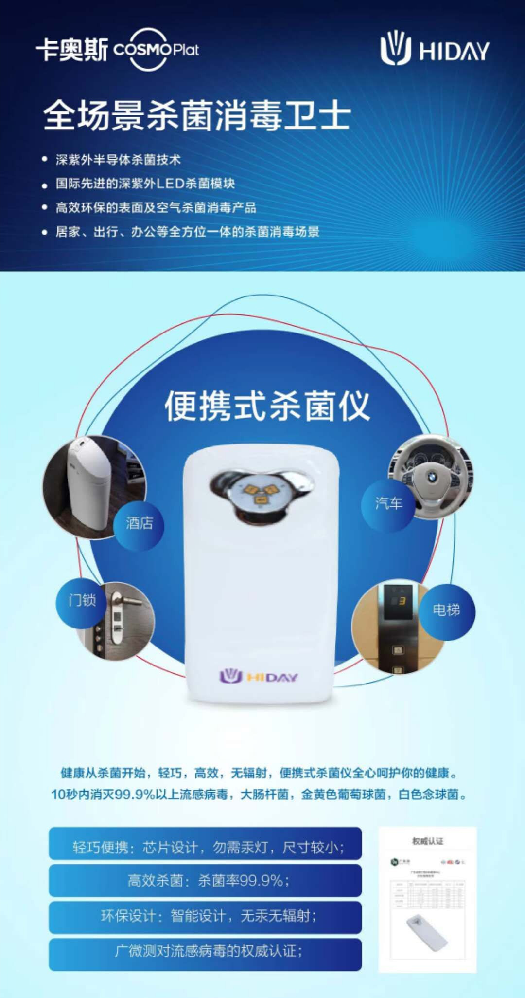 目前,针对生活与工作场景频繁转换的安全需求,卡奥斯COSMOPlat凭借其在场景化解决方案领域的优势,为企业奉上了全场景杀菌解决方案。平台旗下海达维空气净化器、便携式杀菌仪(深紫外线)等产品,能够满足出行、居家、办公等多场景下的杀菌消毒工作,实现科学防疫。