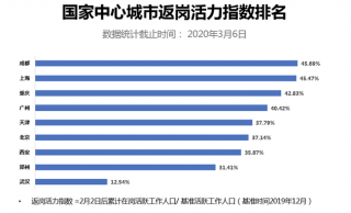 从国家中心城市返岗的情况来看,截止3月6日,成都返岗活力指数45.69%、上海45.47%、重庆42.83%位列前三。广州以40.42%位列第四,天津37.39%,首都北京以37.14%位列第六。武汉则因为是疫情防控力度的强劲城市,受疫情影响较大,返岗活力指数仅为12.54%。