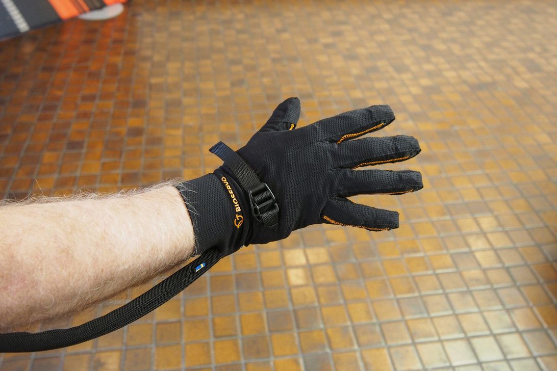 Ironhand手套由几个主要的部件组成,其中有一个比较轻薄的、有弹性的手套,很像在车库里工作时候戴的技工手套,一个电池组,一些驱动马达,一个软管连接每个指尖上的压力传感器,大体积的组件或者被放置在背包里,或者放置在腰包里,当工人拿起一个扳手时,压力传感器会反馈你施加了多大的力,然后Ironhand手套就会施加力度帮助你的手指进行握持。