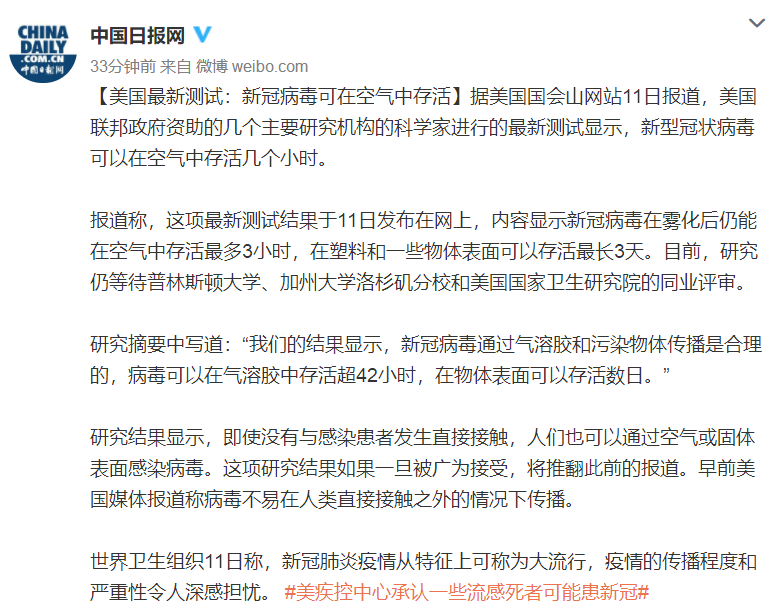 (原题为《美国最新测试:新冠病毒可在空气中存活》)