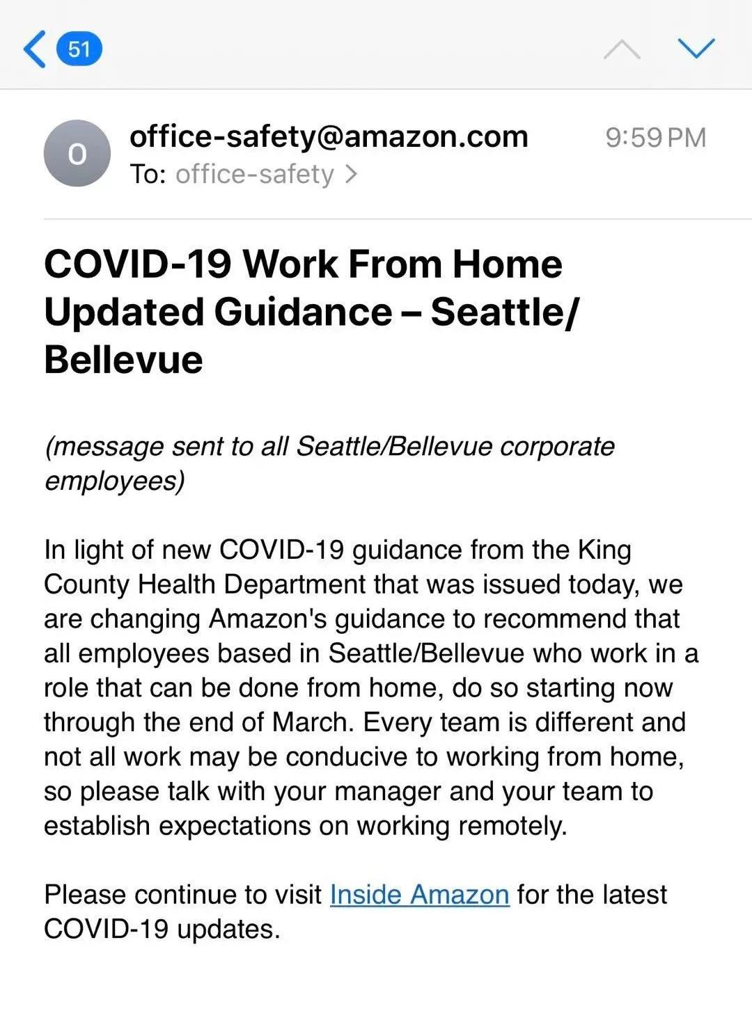 3月5日,亚马逊相继关闭了自己西雅图的办公室,强制所有员工在家办公,并等候政策是否延期的通知。