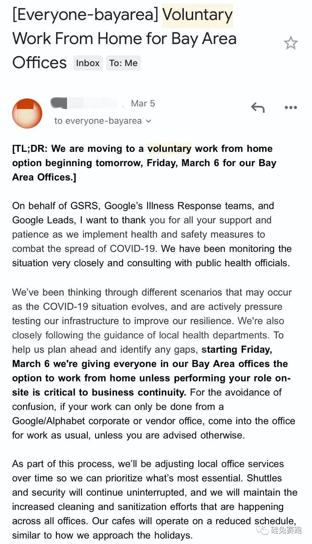 3月6号,谷歌总部宣布允许湾区的员工在家工作,随后谷歌高层发送了全公司范围的公开邮件,告诉员工除非有必要,否则应该取消一切大型活动,并定制了详细的旅行禁令,限制员工前往四个疫区国家出差,分别是意大利、伊朗、韩国和日本,并禁止任何去西雅图和三番地区办公室的访问活动。
