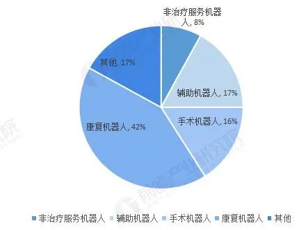 我国医疗机器人种类较多,主要包括康复机器人、服务机器人、手术机器人、非治疗服务机器人以及其他机器人等。其中康复机器人占主要比重,比例达到42%,其次为辅助机器人,占比为17%,手术机器人占比16%,非治疗服务机器人占比8%。