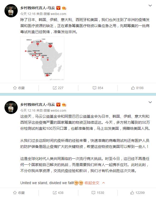 同时,马云还表示,我们也关注到了非洲的疫情发展和医疗资源的缺乏,正在紧急筹集医疗物资以备应急之用,先期筹集的一批病毒试剂盒已经就绪,准备发往非洲。