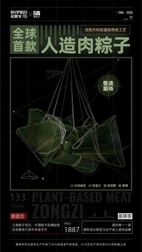 此外,星期零将与中华老字号诸老大联合研发中国第一款人造肉粽子。人造肉粽子将于今年的端午节售卖。