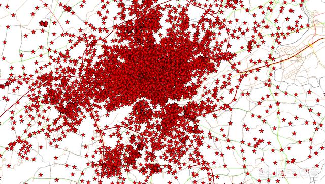 这是一张城市里的4G基站分布图,可以明显看到城市中心区域的基站密度要远远的大于郊区农村的基站分布。