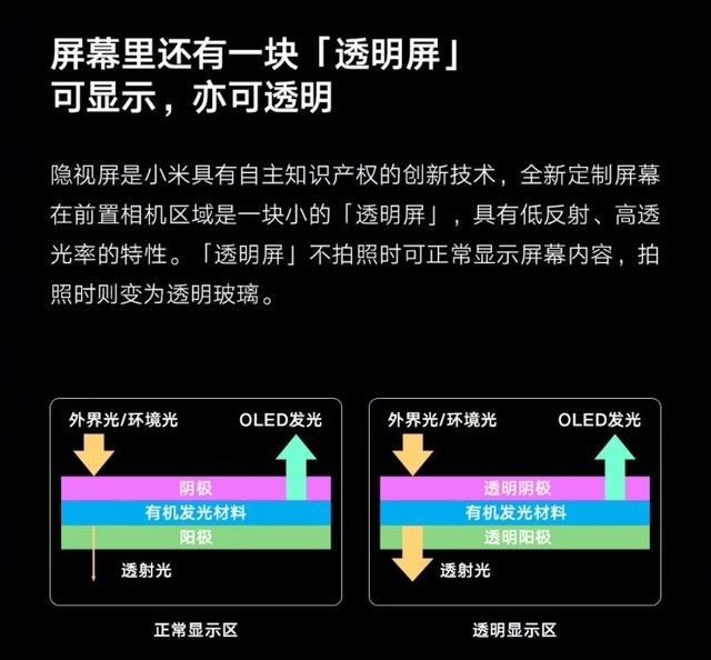 屏下摄像头利用了OLED屏幕自发光特性,同时从技术层面来说,OLED屏幕是完全可以做成透明的。所以在前置摄像头区域,是一块小的透明屏幕。