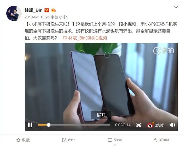 与OPPO类似,6月3日小米林斌也在微博上展示了小米的屏下摄像头样机的演示视频,小米称这项技术为“隐视屏”,同时小米还强调,隐视屏是小米具有自主知识产权的创新技术。并做了屏下摄像头科普。