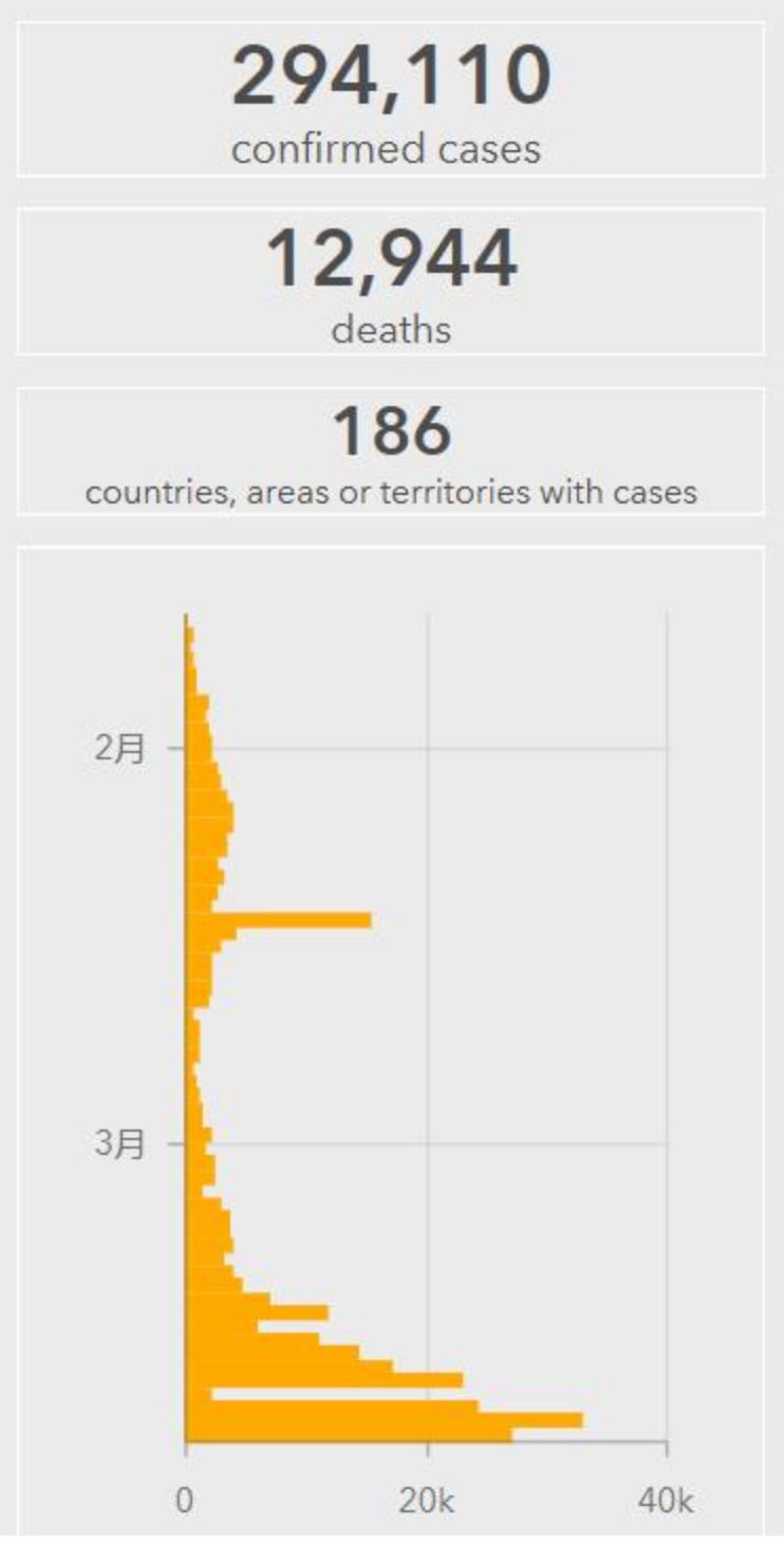 世卫组织实时统计数据显示,截至北京时间23日0时59分,全球确诊新冠肺炎294110例,死亡12944例。 目前全球已有186个国家和地区出现新冠肺炎确诊病例,中国以外新冠肺炎确诊超过21万例。
