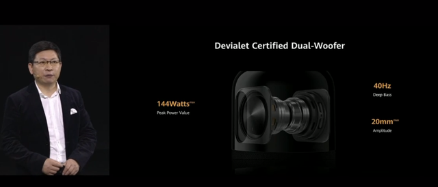 华为Sound X内置60W双低音炮(两个3.5英寸低音喇叭)和6个1.5英寸全频喇叭,可打造出360°环绕立体声的音效。同时,该音箱搭载了四核1.5GHz处理器,内置512MB运存和8GB存储,支持蓝牙5.0技术。