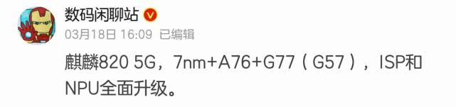 根据博主@数码闲聊站 的爆料,麒麟820 CPU用的是A76架构,和前代一样。