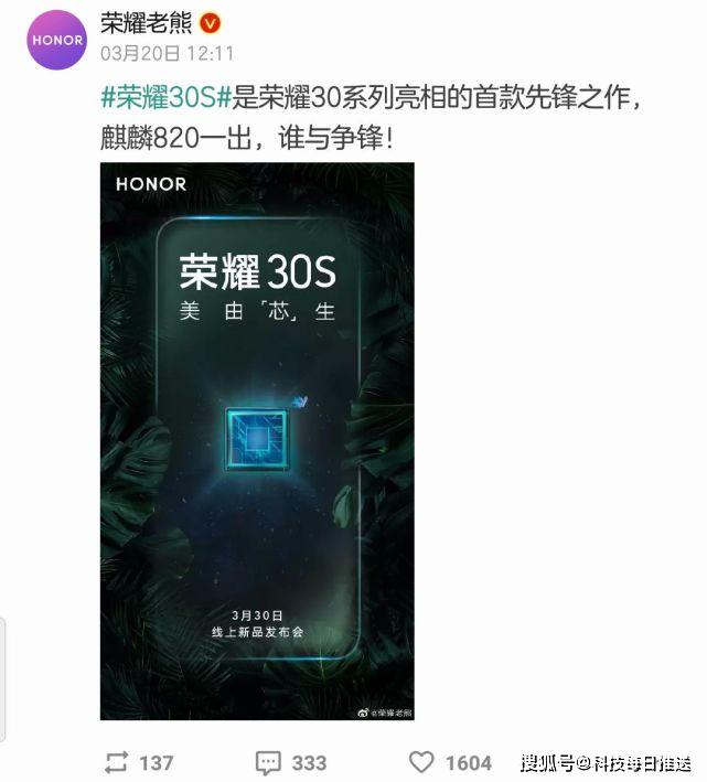 终于,3月20号,荣耀业务部副总裁熊军民透露,麒麟820将由荣耀30S首发,于本月30号与我们见面。