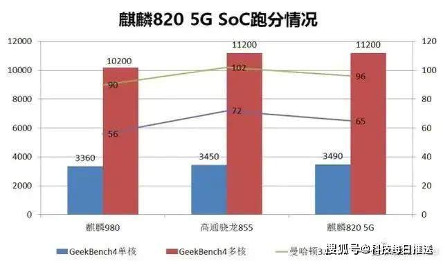 从图上来看,麒麟820单核3490分,多核11200分,均超过麒麟980。