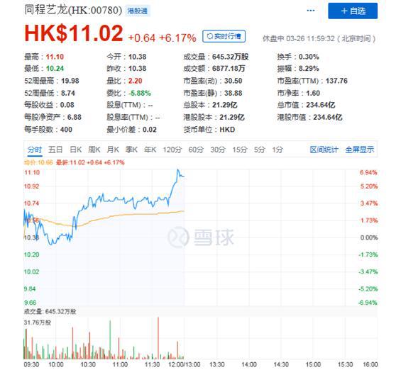 受财报的利好刺激,同程艺龙今日开盘股价持续走高,截至发稿涨逾6%,报11.02港元,最新市值234.64亿港元。