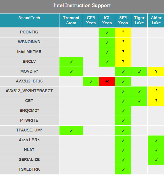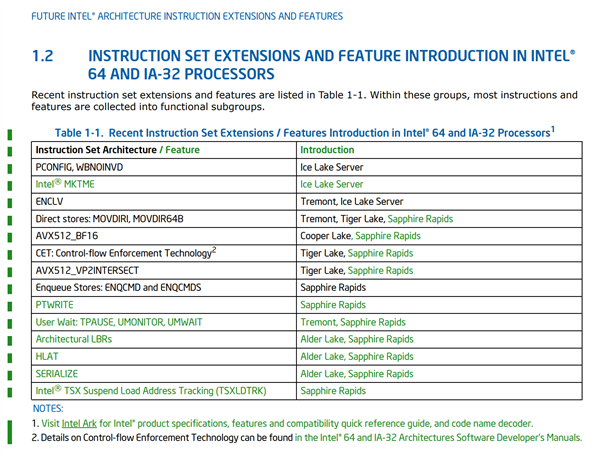 ,包括AVX512_VP2INTERSECT、CET、ENQCMD、PTWRITE、TPAUSE/UM、Arch LBRs、HLAT、SERIALIZE、TSXLDTRK,不过也有一个悬念,那就是PCONFIG、WBNOINVD、MKTME、ENCLV等指令集是否继续支持尚未明确。
