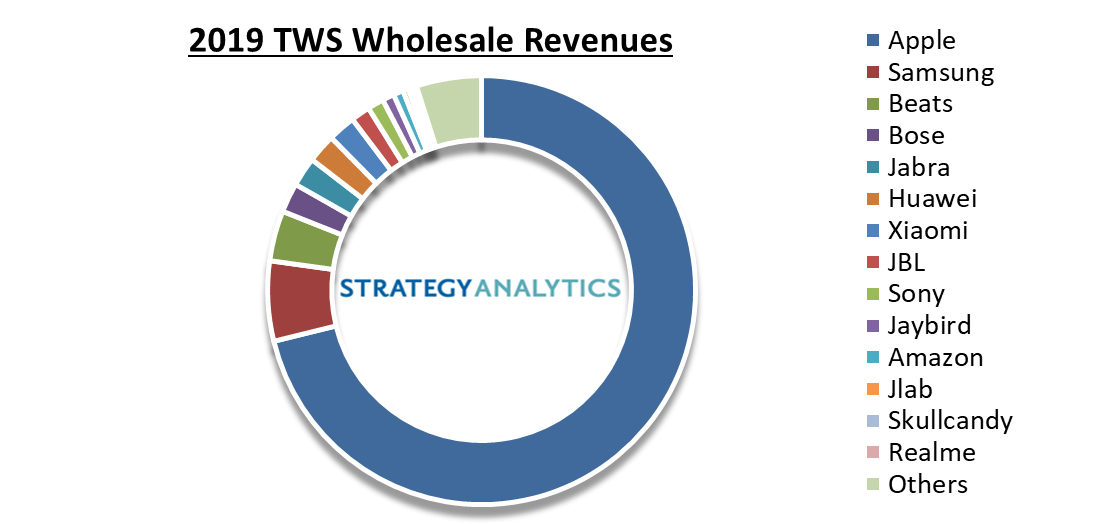 据Strategy Analytics的数据报告显示,在2019年,苹果真无线耳机AirPods的销量接近6000万。增长率超过70%,还拿走了真无线耳机市场71%的销售额。由此可见,AirPods深受市场追捧。有分析师预测2020年,AirPods出货量可达8000万-9000万只。不过,受疫情影响,苹果将AirPods的订单削减了10%以上。