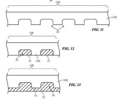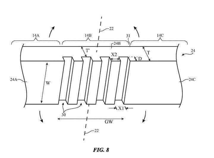 如专利图所示,苹果希望能够在柔性屏幕折叠处的里侧切割出一系列凹槽,并使用和屏幕原材质折射率相同的弹性聚合物或液体填充凹槽,使得凹槽实际上不会影响到屏幕的显示效果。当用户对屏幕进行折叠的时候,凹槽处的弹性聚合物就会进行压缩,当屏幕被再次打开时,凹槽处的弹性聚合物就会被释放开来以填满凹槽,苹果希望能够通过这样的设计来解决折痕问题。