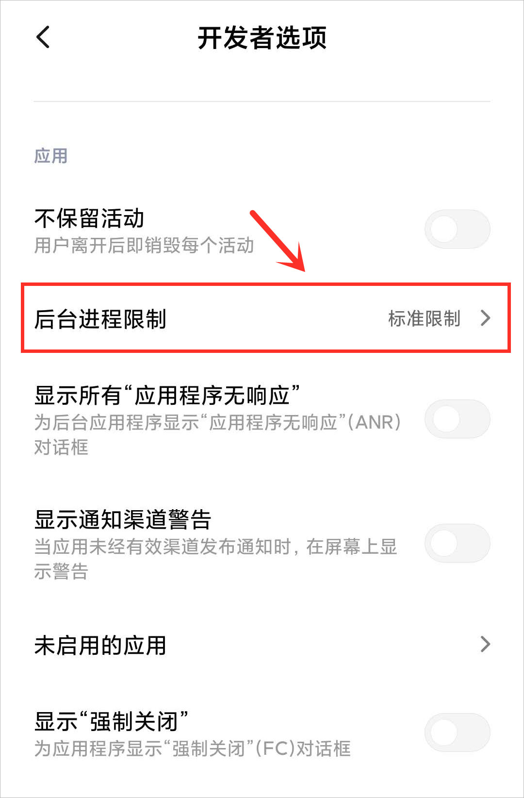 这个设置完之后,我们进行下一步的设置,在开发者选项的应用中,找到后台进程限制这一栏目,并点击进入,系统默认的是标准限制。