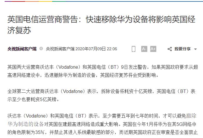 与华为同样着急的,还有英国的电信运营商。因为它们在1月份的决定之后,正在大规模采用华为的5G设备建设新的高速网络,如果情况再次发生反转,对这些电信运营商的不利影响难以估量,因此它们也希望英方不要草率做出禁用华为的决定。根据央视报道,就在7月9日的时候,美方的这个铁杆盟友再次被沃达丰和英国电信这两大运营商警告,如果英国要求从新的5G网络建设中撤除华为制造的设备,沃达丰将耗资上十亿英镑,而英国电信至少要耗资5亿英镑,仅仅这两个运营商就需要多花132亿人民币。