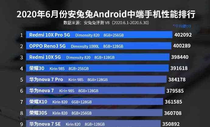 就制造商而言,中档产品种类不多。但是,华为和荣耀的设备是最多的。Redmi10XPro排名第一,OppoReno的新版本仅排名第十。