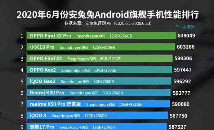 从安兔兔的测评上可以看出,功能最强大的智能手机列表由两家制造商掌握。Oppo和Redmi(以及小米)似乎最有话语权。OppoFindX2Pro稳稳地占据第一。这是一份有意思的排名,具体如下: