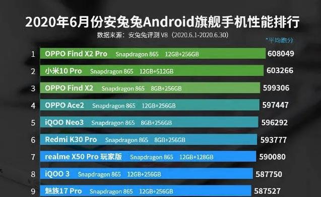 6月手机性能前十,一加8p垫底,小米第二,华为无缘!